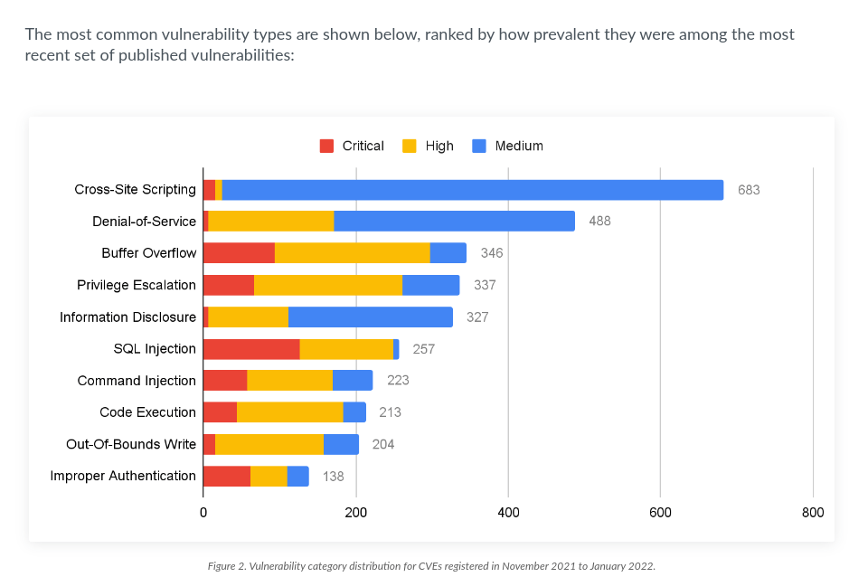 In Figure, the most common types of vulnerabilities are listed in order of how common they were in the most recent set of vulnerabilities that were made public.