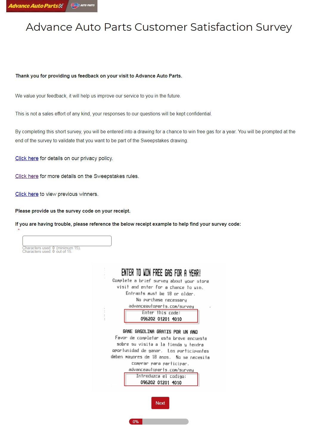 - An Advanced Auto Parts purchase receipt with the survey code mention on it is required.