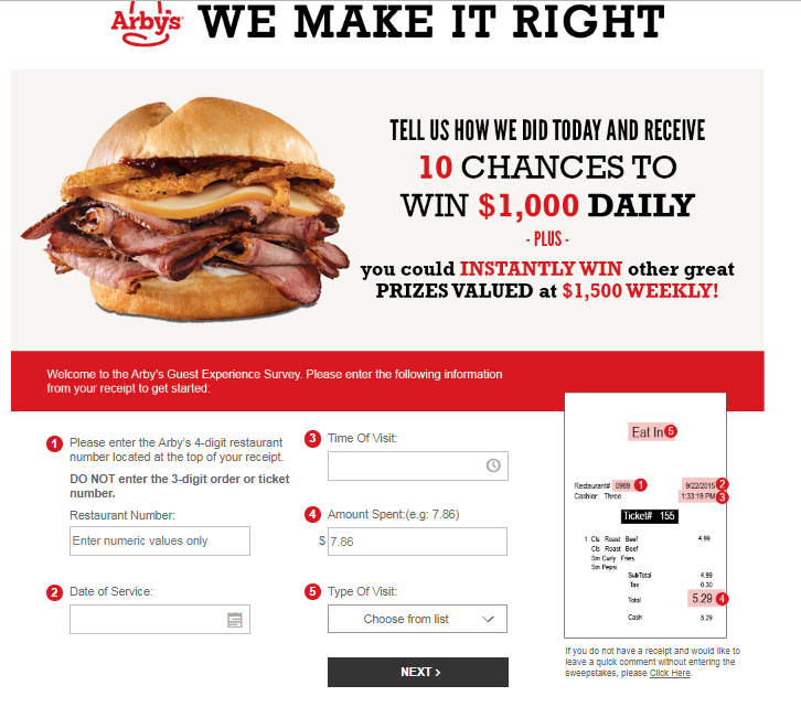 - Visit the Arby’s Guest Experience Survey Link www.arbyswemakeitright.com.