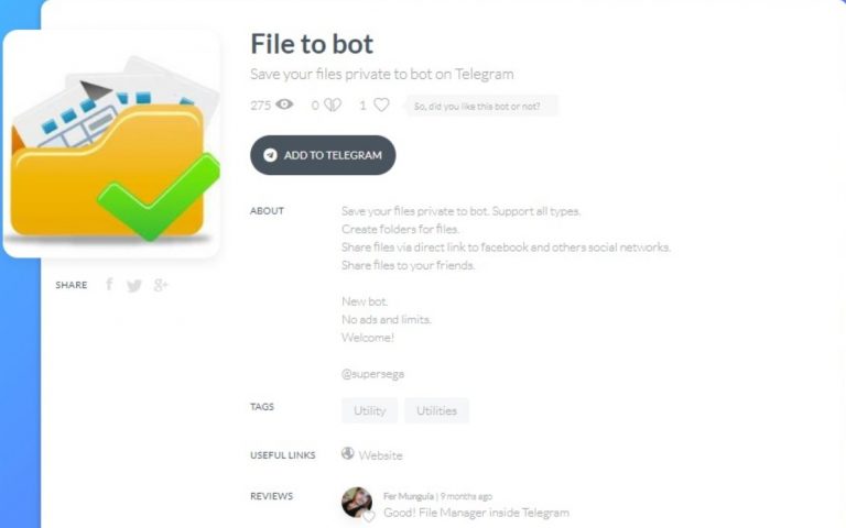 File to a bot is another best telegram bot that can be used to store files on the cloud with unlimited storage. Whenever you will send files to this bot, it will categorize those and store them. You can check and download those files any time you wish in the future. You can even create links for specific files that can be shared with others as well.
