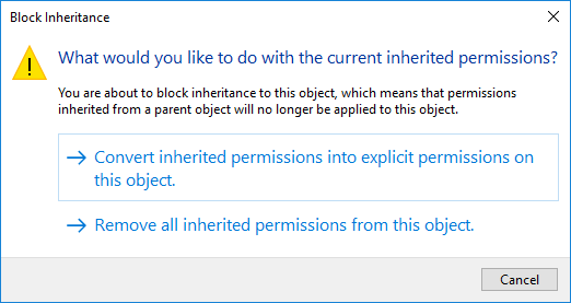 D- Two options would be available for you as shown in the below image and in that you need to select the second one that is “Remove all inherited permissions from this object”. You are in the end just wait for confirmation. This action will remove all inherited permissions.
