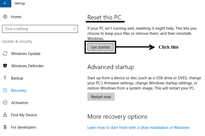 - Go to“Recovery” and then click on “Get Started” under Reset This PC.
