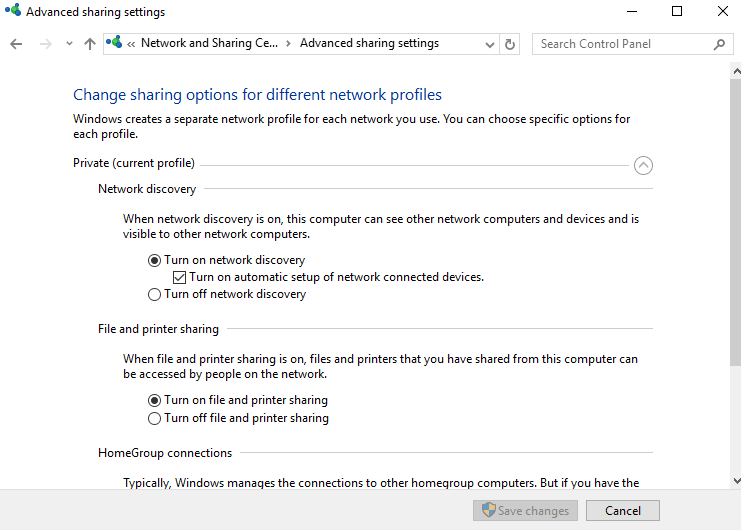 Step 6- Turn on network discovery and then turn on file and printer sharing.