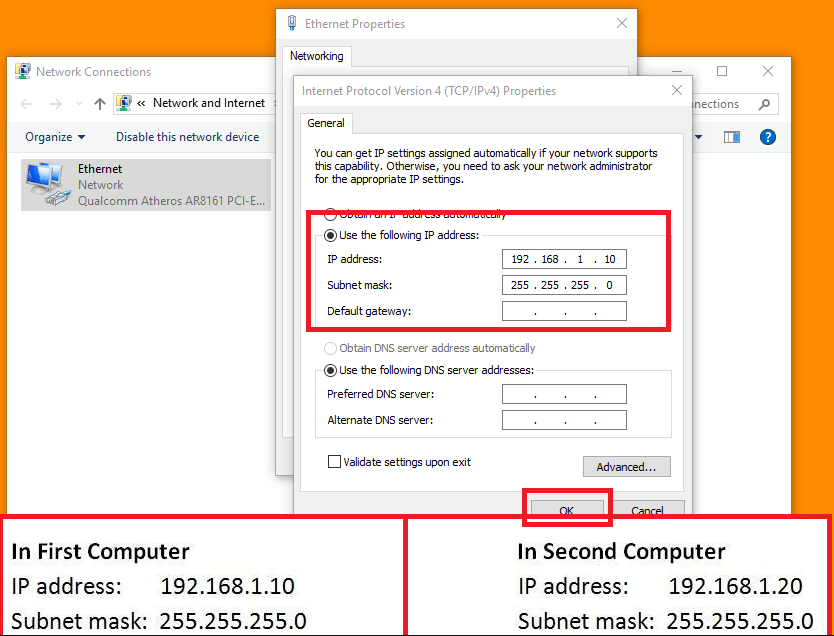 Step 10- set the subnet and IP address in both the systems simultaneously.
