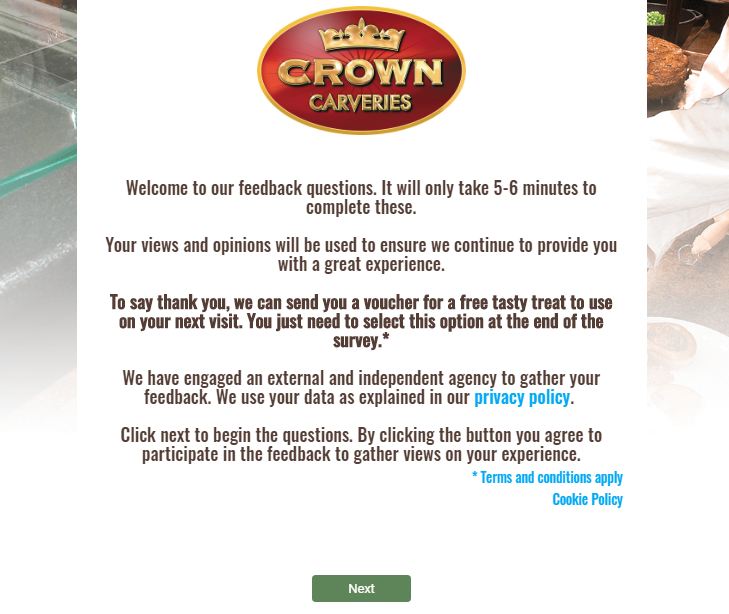 Check out the below mention complete process to finish Crown Carveries Survey. Follow the steps mentioned to get your Voucher.