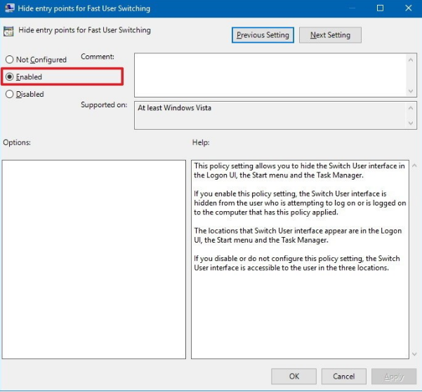 Anytime if you need to enable the Switch user feature, you can do it by following the above process, but in step8 select Not Configured option there.