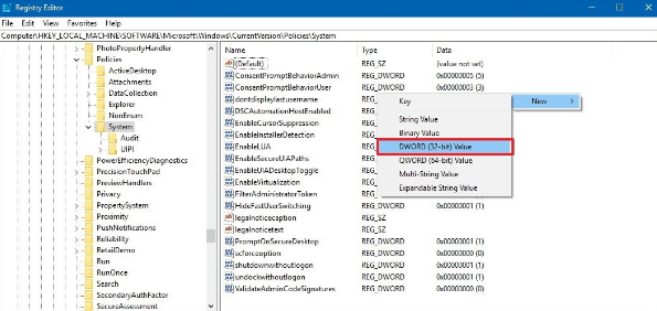 Step 8: After right-clicking on system option select new and from there DWORD (32-bit) Value.