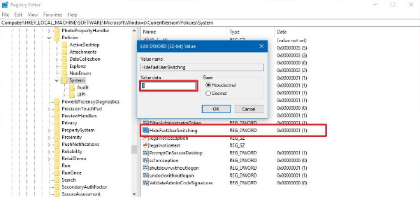 In any case, if you want to enable this feature to follow the given process but in step 12 set the value of HideFastSwitching from 1 to 0. Or you can simply delete HideFastSwitching to remove it by right-clicking on it.