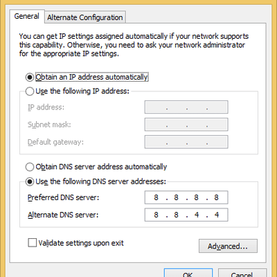 Step 7: set preferred server address as 8.8.8.8 and alternate DNS server address as 8.8.4.4 and then click on the OKAY tab given below.