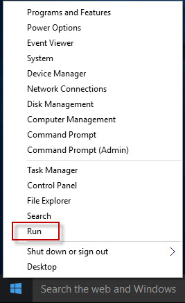 - Right Click on the WIN logo at the lower left corner of the desktop or simply press WIN+X from the keyboard shortcuts and then the popped up menu will appear from where you need to click on RUN to open the RUN dialog box