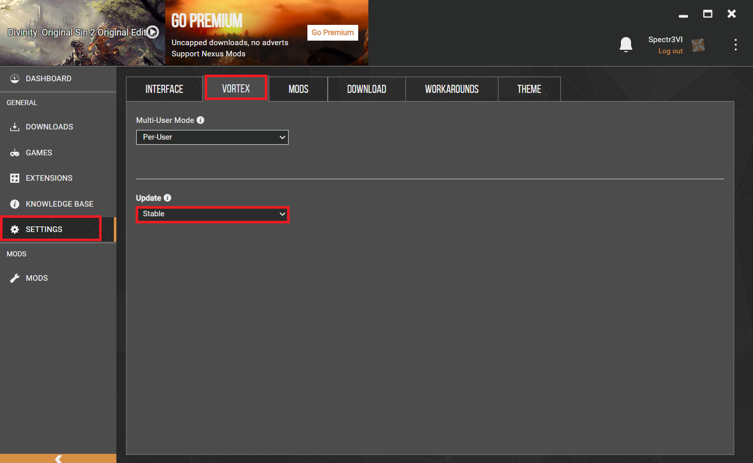 Step 3: Under ‘Update’, set the option to ‘Stable’. This will allow Vortex to automatically update itself.