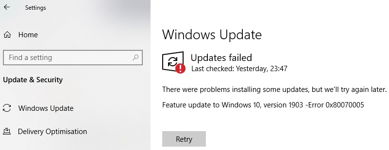 Introduction To ‘Feature Update To Windows 10, Version 1903 – Error 0x80070005’