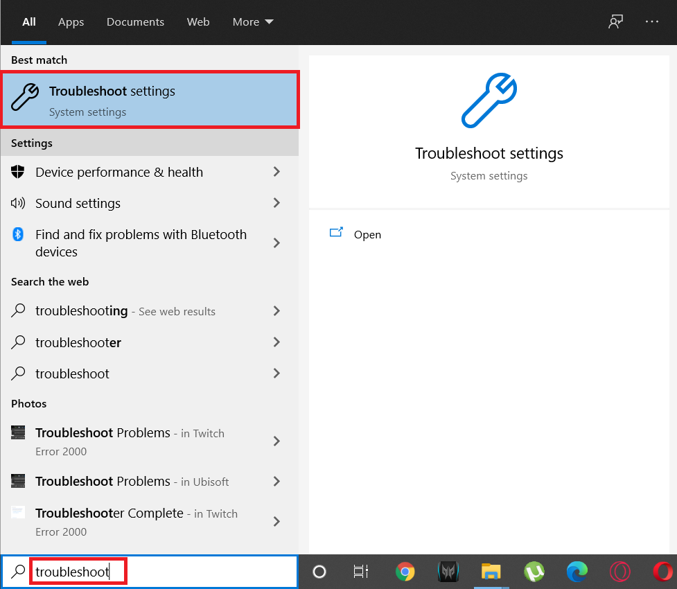 Step 1: Go to the Search feature on your Taskbar and type in ‘Troubleshoot’. Click on the ‘Troubleshoot settings’ menu.