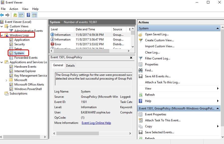 Step 2: Secondly, click on “Windows Logs” and then “System” present on the left side of the panel in your PC.