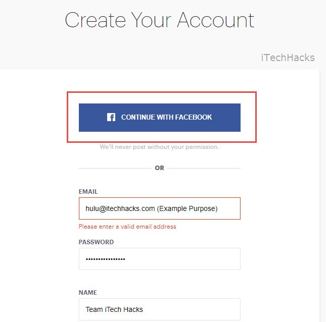 Step 4- Fill in all the fields with Hulu account free login password details. Or you can directly login using Facebook.