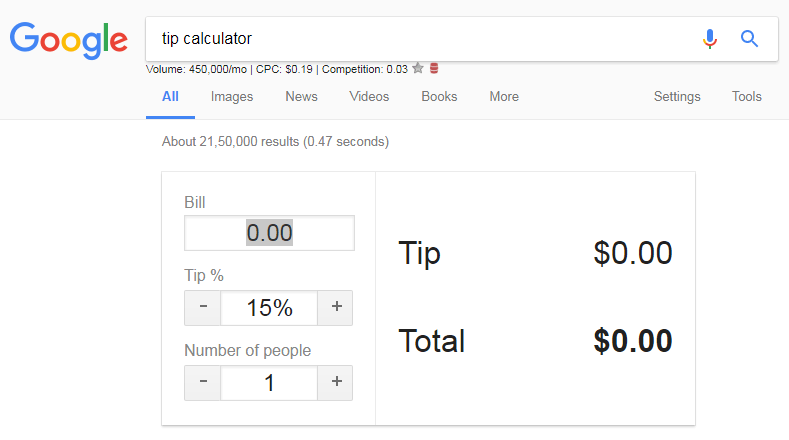 11. You can even calculate the tip on Google as it provides an easy Tip calculator. Type tip Calculator and hit enter.