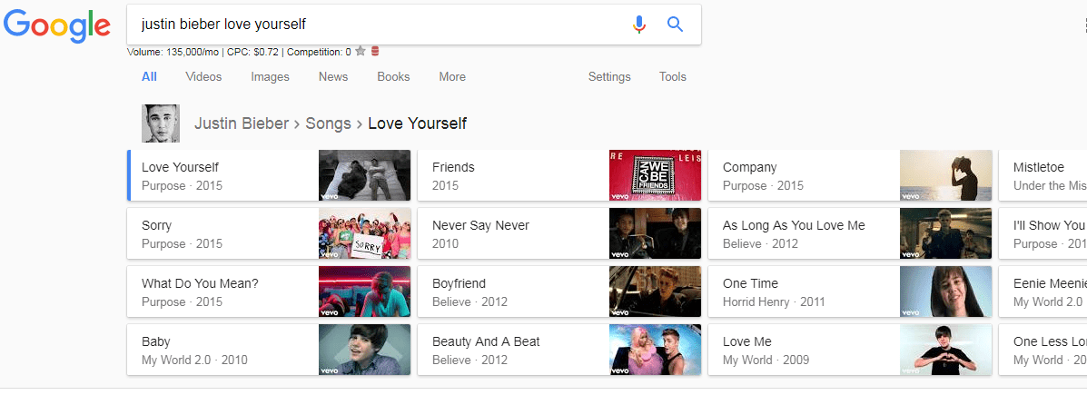 16. All people have their favorite musician or singer and if you want to hear songs then type “songs by artist name” and hit enter. Google will show you the list. Click on any song and view it on Youtube.