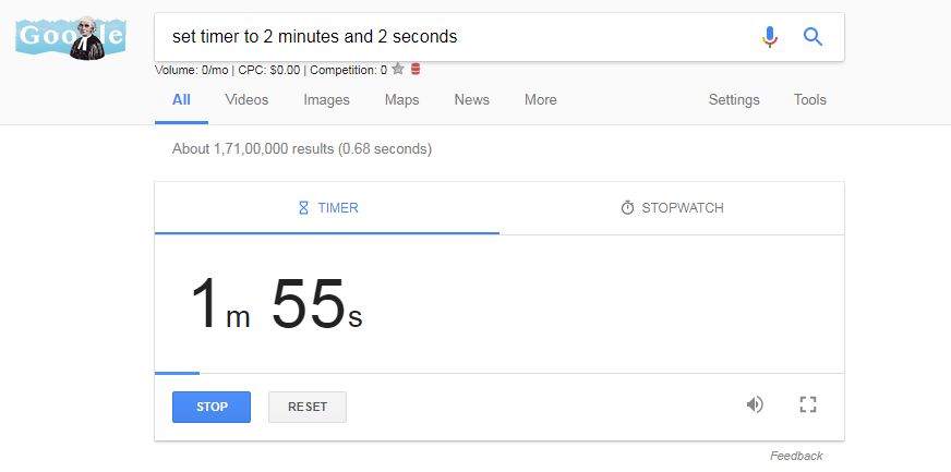 5. Sometime in sitting before a computer screen, you might forget other thing or work. So Google also avails you to remind you of a specific time. Yes, you can ser timmer on Google. Type “set a timer to 2 minutes and 2 seconds” and hit enter. Click on the first very first line which will redirect you to a stopwatch. Google will remind you of 2 minutes and 2 seconds through an alarm music.
