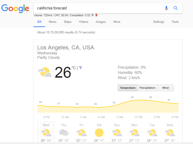 8. Like as Sunrise and sunset you can even check on Google the weather forecast for a place. Google will show you the temperature, humidity, precipitation, wind speed. Type on Google California Forecast, it will show all the details.