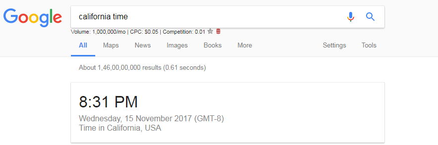 9. If you want to know the exact time of a place then Type on Google the name of place and time. For eg California Time.