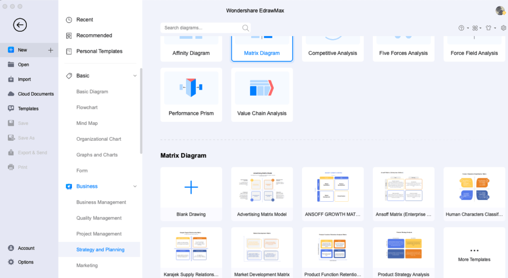 - Template Access: EdrawMax has 1400+ built-in templates that make it easy for someone to create complicated diagrams. Head to the ‘Business’ diagram type and click on ‘Strategy and Planning.’ In this diagram category, click on the ‘Matrix Diagram’ types and head to EdrawMax’s canvas to start creating the SWOT matrix framework. In addition, you can access the ‘Templates’ section on the left and search ‘SWOT Analysis’ to duplicate user-generated SWOT analysis templates.