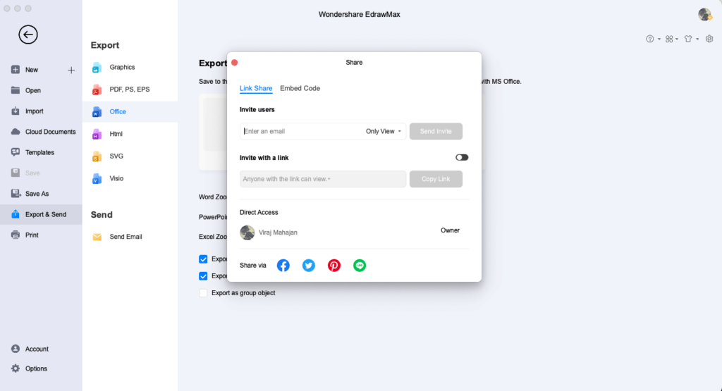 - Share Options: With EdrawMax, you can share your diagrams in multiple formats, like JPEG, PNG, HTML, Docs, Excel, PPTX, VSDX, and more. With this free personal SWOT analysis software, you can also share SWOT analysis to your Facebook or other social media accounts.