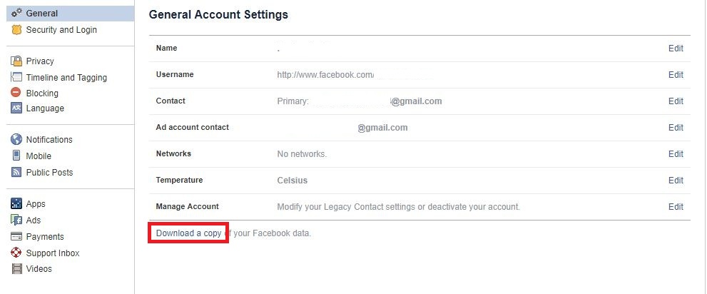 Second Step – Now you will have to log in to your account. Then to delete a Facebook account, first, you need to go to settings and click on “Download a copy.” in order to download all your account information.