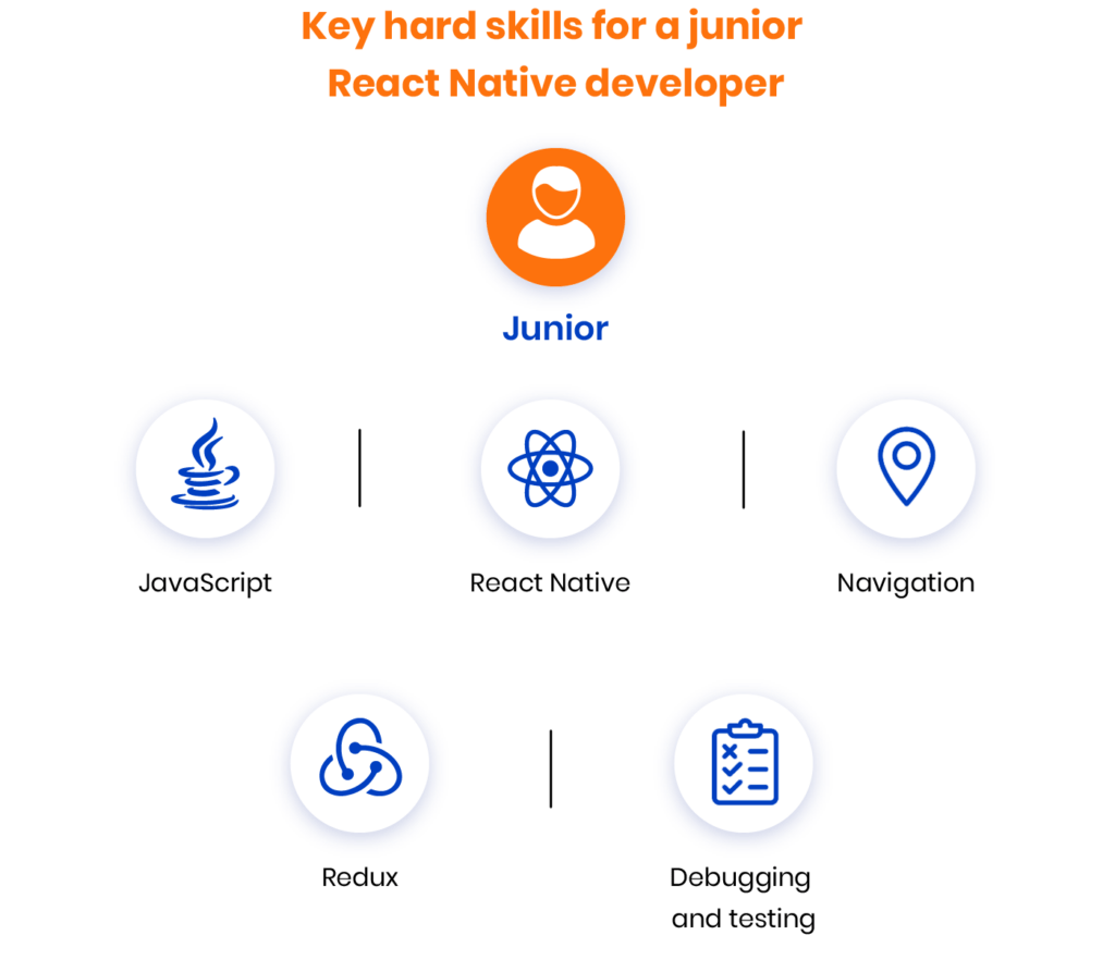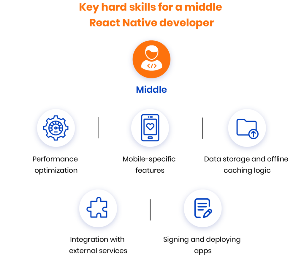 Levels of responsibility in Junior, Middle, and Senior grades differ significantly; they also define the professional standards and particular requirements to consider when hiring React.js developers.