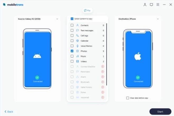 Step 4: You will see the list of contents that you can transfer. Check the files you wish to move. Then, click on the “Start” button. Always remember not to disconnect any device during the whole transfer process. Then, the data will be transferred from Samsung S21 to iPhone 13.