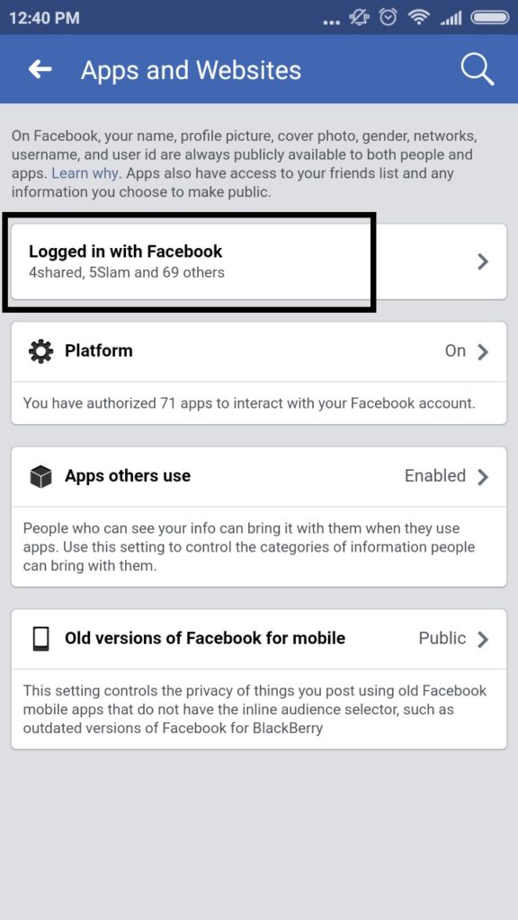 Tap on “Logged in with Facebook” option to see which websites and apps are linked with your Facebook account.