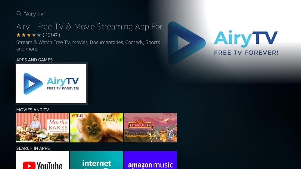 Step 2: Type ‘Airy TV’ and you’ll find the app (the one with a blue triangle logo). Select that.