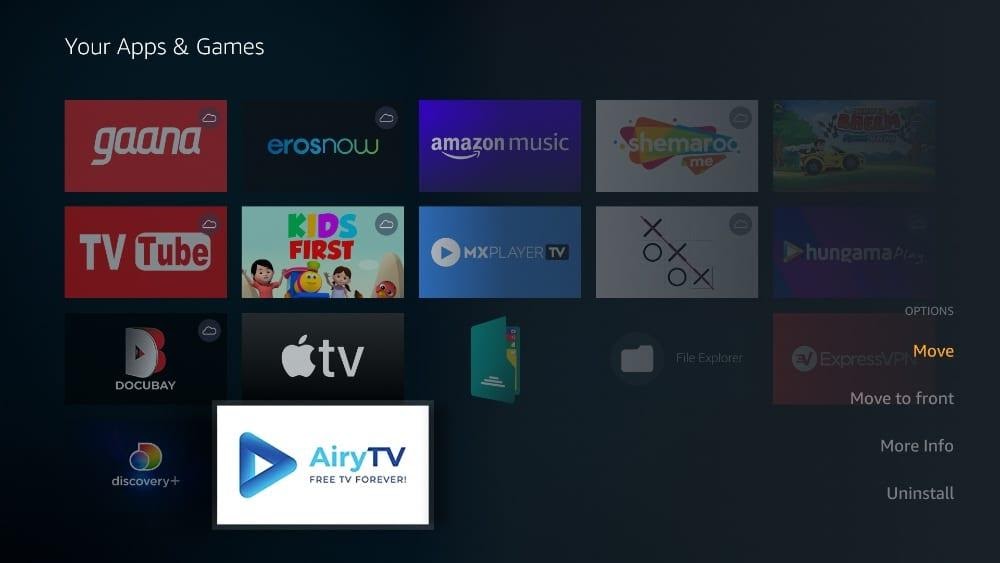 Step 6: If you want to access the app from your Home Screen itself in the future, press the ‘Option’ button on your remote, and then ‘Move’, to place Airy TV on the top row.
