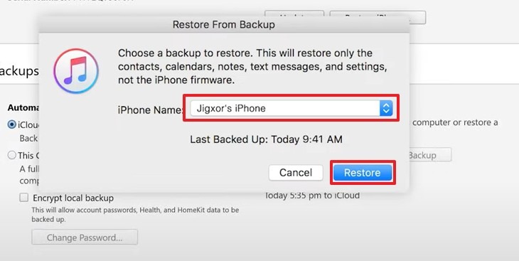 Step 2. From the dropdown menu, select the backup file created before you deleted the photos. After that, click the “Restore” option and wait for the process to complete. Do not disconnect your iPhone until it has restarted and synced with the computer.