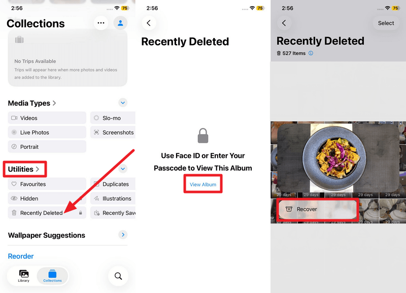 Instructions: Within the Photos App, scroll down to the “Collections” tab and choose the “Recently Deleted” folder under “Utilities.” Open it with Face ID as you press the “View Album” option, and long-press the image to choose the “Recover” option.