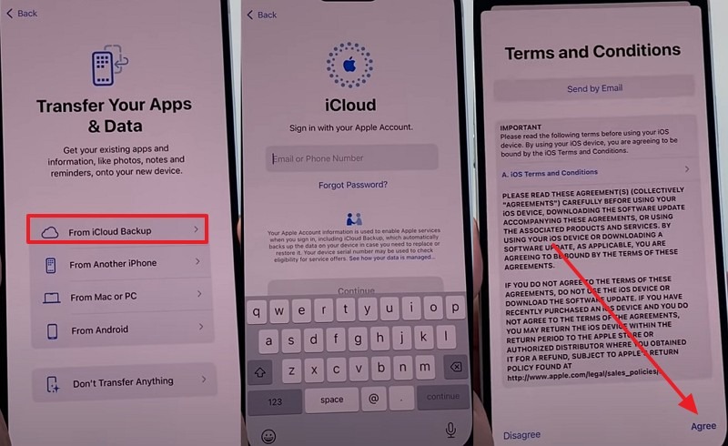 Step 2. On the setup screen, choose the “From iCloud Backup” option, enter the Apple ID details, and “Agree” to the given terms and conditions.