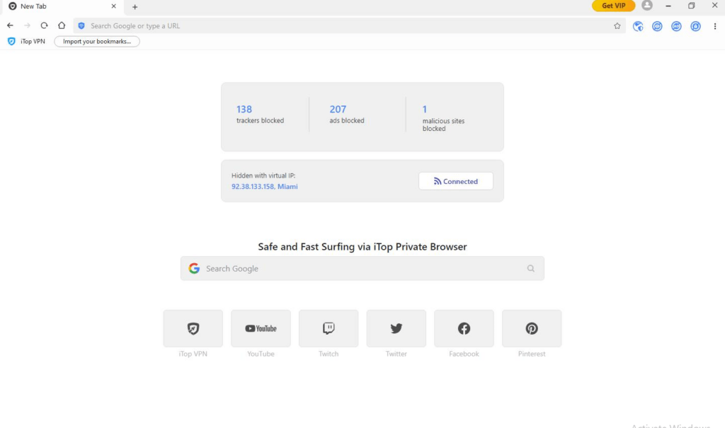 iTop Private Browser uses the built-in VPN to hide your real location and protect your online privacy. It can hide IP addresses and connect to the virtual IP addresses to browse anonymously.