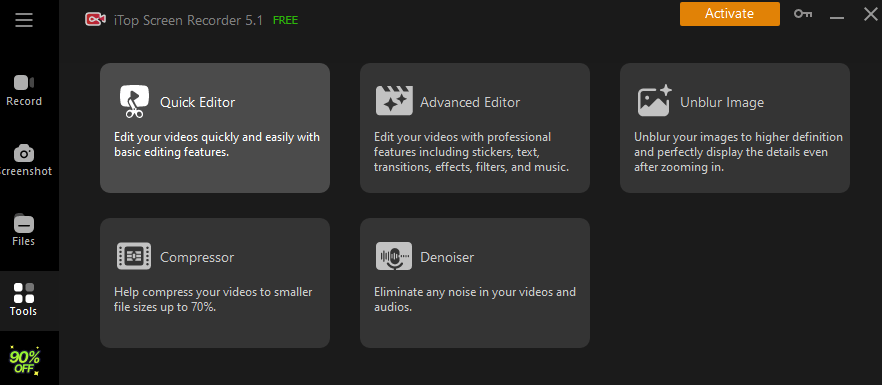 After opening iTop Screen Recorder, you’ll see a simple and intuitive interface with options for different recording scenarios. The main menu has settings for screen capture: