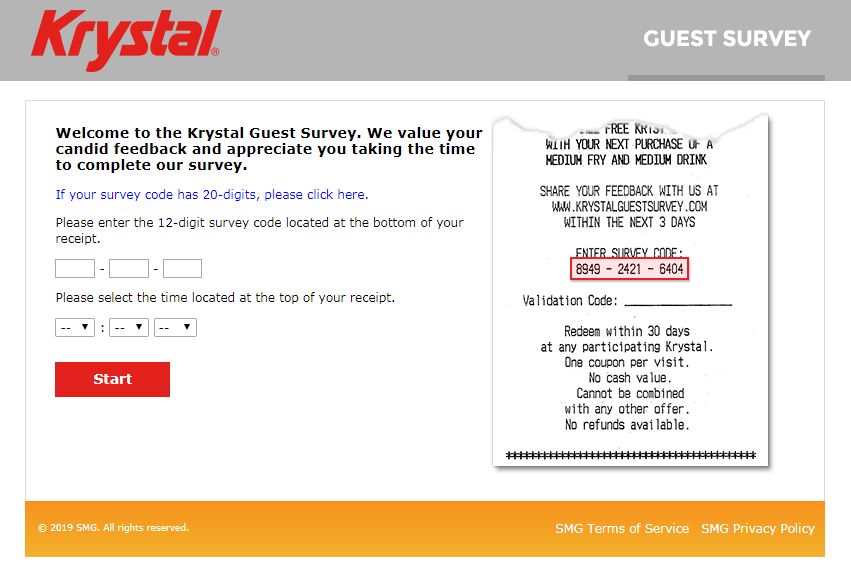 - A Krystal Purchase Receipt is required with a survey code on it.
