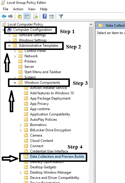 Step 3: Go to Computer Configuration > Administrative Templates > Windows Components > Data Collection and Preview Builds.