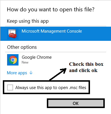Step 2: Then you will get a window asking how to open the app. Just select the Microsoft Management Console and click OK.