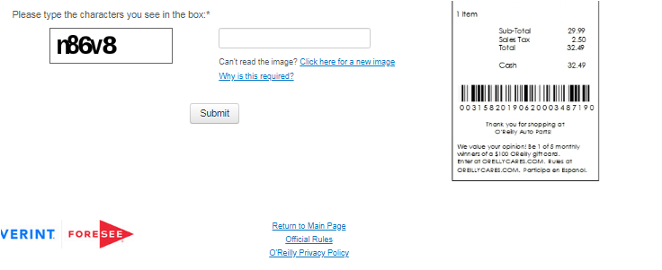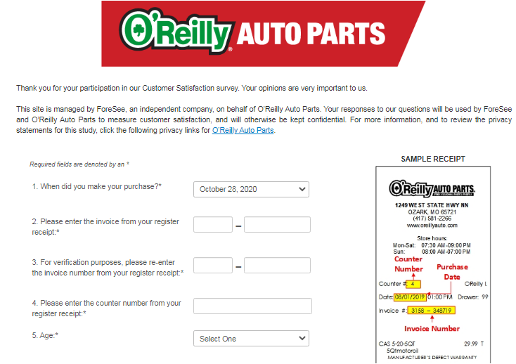 - An O’Reilly Auto Parts purchase receipt with the survey code mention on it is required.