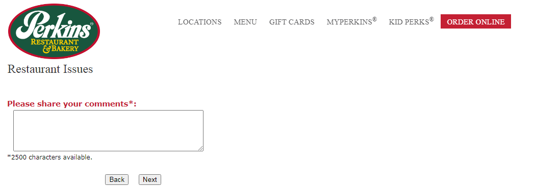 - And. if you select the second line then enter your experience in some words ( around 2500 ) about how you feel after dining at Perkins Restaurant.
