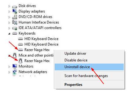 Step-3: Find and then right-click on each Razer device > Uninstall device. Select delete drivers.