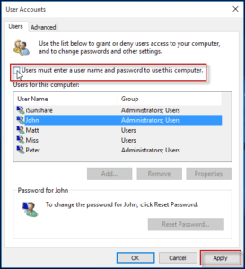 - Open the User Account and select the user through which you want to bypass the password. Click Apply after unchecking the option, Users must enter a username and password to use this computer.
