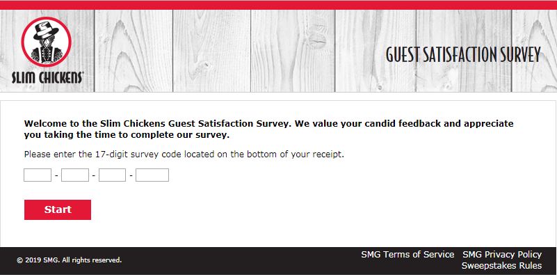 - A Slim Chickens purchase receipt with the survey code mention on it is required.