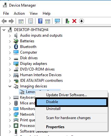 Then Right-click on the driver below Imaging Devices and choose Disable.