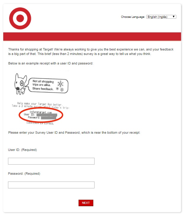 - A Target purchase receipt with Survey User ID and Password mention on it.