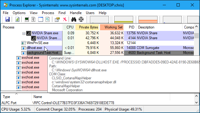 If you want to see which file dllhost.exe process is hosting then you can download Microsoft’s Process Explorer tool. As shown in the below picture that Com Surrogate is hosting CortanaMapiHelper.dll object.