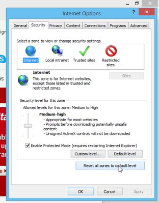Step 2: Wait while Internet Explorer is loading and then select the Security tab. You will see one line stating “Reset all zones to default level”, click on that followed by the Apply button. To save all these settings hit on OK.