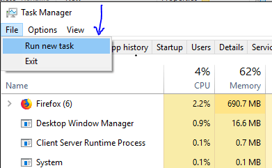 Step 1: Open Task Manager > Select File option > choose Run new task.